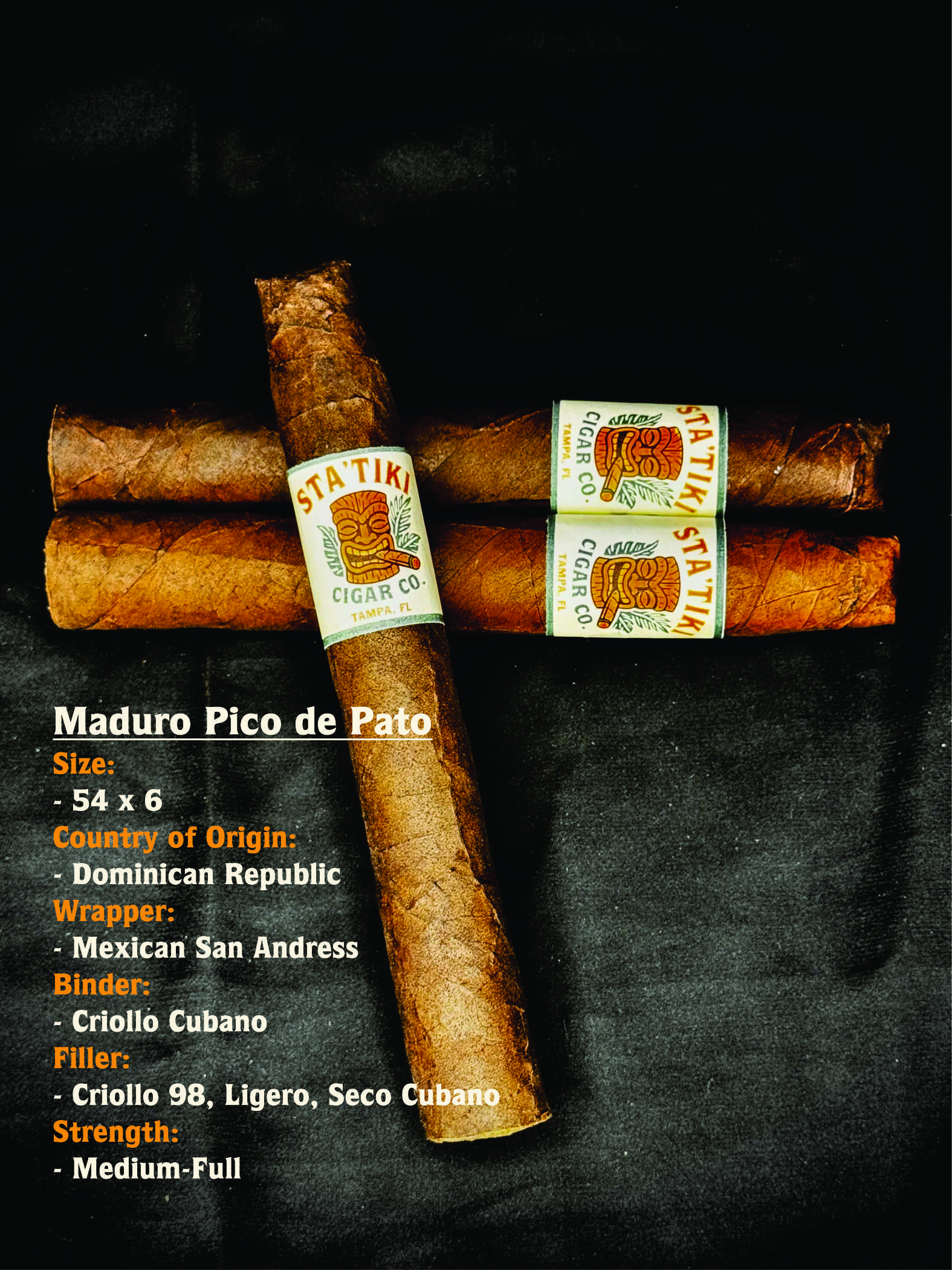 For the aficionado seeking depth and character, the STA’TIKI Cigar Co. Maduro Pico de Pato is a must-try. This cigar is blended for a medium-to-full strength experience, offering layers of rich, dark flavors that evolve throughout the smoke.